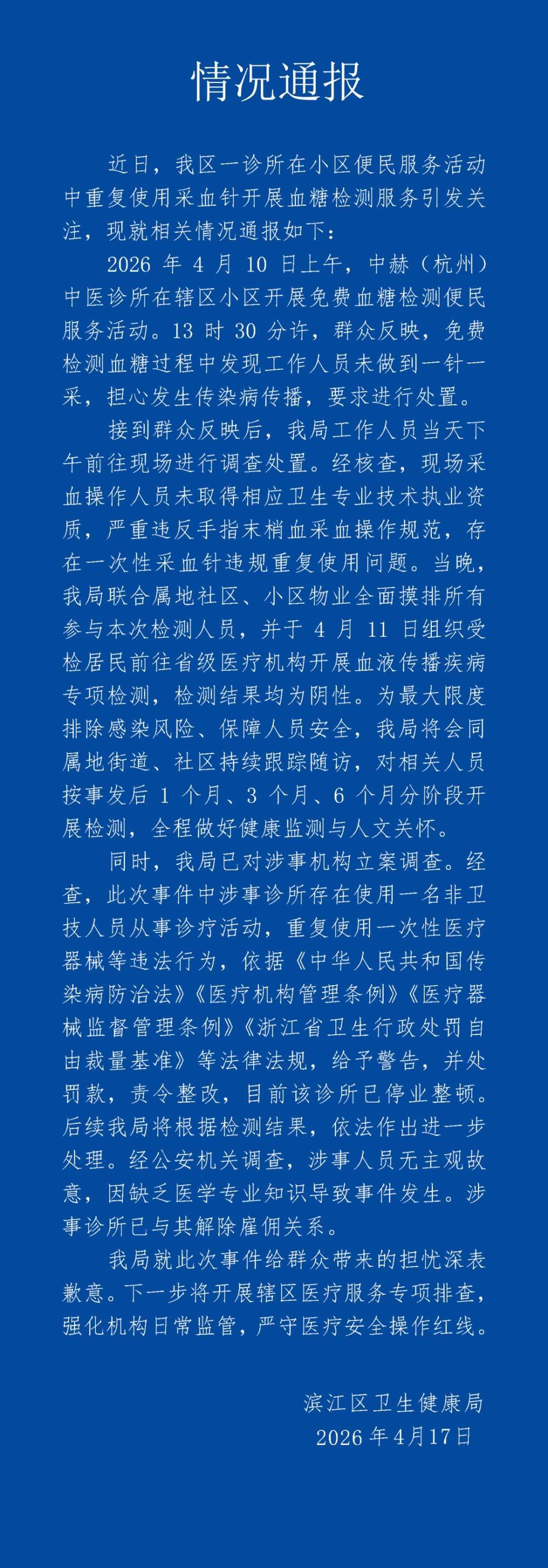 4月17日下昼星空app,杭州通报一诊所“用一个针头给多东说念主采血”。